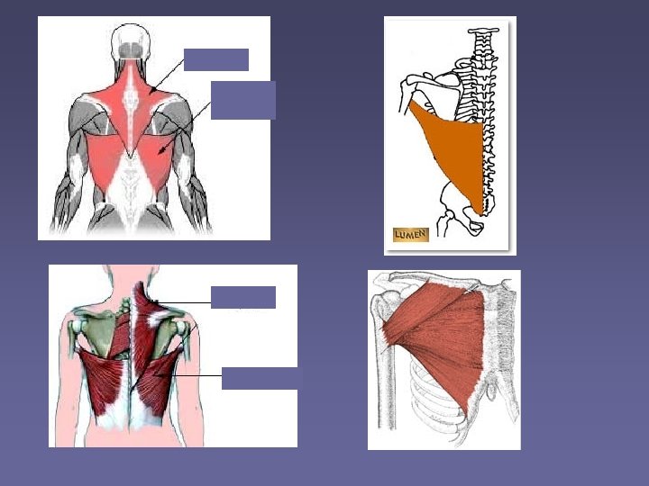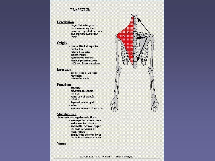 Trapezius § Origin: Occipital bone, ligamentum nuchae, spinous process of the C 7 and all Thorasic vertebrae § Insertion: § 1. Lateral 1/3 of clavicle. § 2. Top of Acromion process. § 3. Upper border of spine of the scapula. § 4. Medial surface of spine of the scapula. § Actions: § Upper – elevation of the scapula § Middle – elevation, upward rotation, & adduction of the scapula § Lower – depression, AC adduction and upward rotation of the scapula