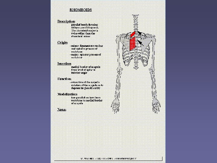 Rhomboid (major and minor) § Origin: Ligamentum nuchea and spinous process of C 1 -7 and 2 -5 T § Insertion: Medial border of the scapula § Actions: § Adduction of the scapula § Downward rotation of the scapula § Elevation of the scapula