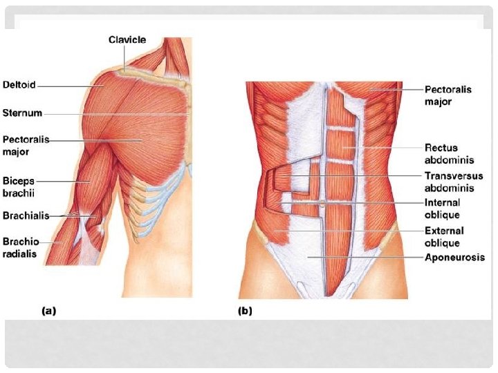 ANTERIOR MUSCLES • Muscles of the Abdominal Girdle- anterior abdominal muscles • Includes: rectus abdominus, external and internal obliques, and transversus abdominus • Reinforces the body trunk • Form a thick wall