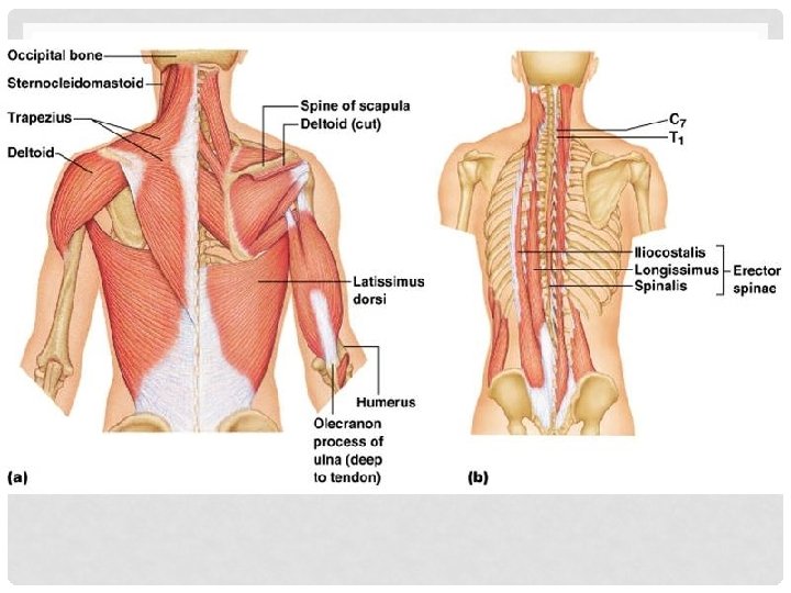 POSTERIOR MUSCLES • Trapezius- runs from occipital bone down vertebral column to the end of the thoracic vertebrae. • Then they flare laterally and insert into the scapular spine and calvicle. • Extend the head • Elevate, depress, adduct, and stabilize the scapula. • Latissimus Dorsi- large, flat muscle pair- covers lower back • Lower spine and illium to proximal end of humerus • Extends and adducts the humerus • Important when swimming or striking a blow