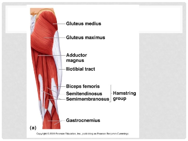 HIP JOINT MUSCLE • Gluteus maximus- forms most of the flesh of the buttock • • Powerful hip extensor Brings thigh in a straight line with pelvis Most important when climbing stairs and when jumping Originates from sacrum and iliac bones and runs to insert on the gluteal tuberosity of femur