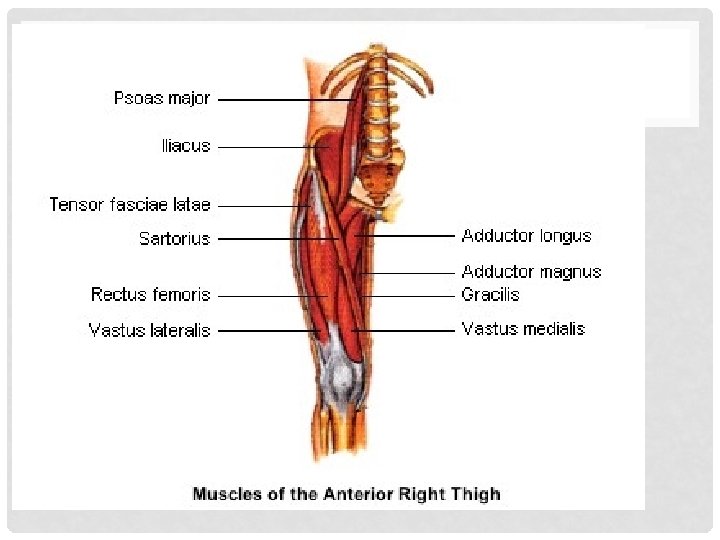 QUADRICEPS GROUP • Rectus femoris and three vastus muscles • Flesh out anterior thigh • Vastus muscles originate from the femur • Rectus femoris originates from pelvis • All four insert into the tibial tuberosity via the patellar ligament • Acts to extend knee powerfully • Flex hip