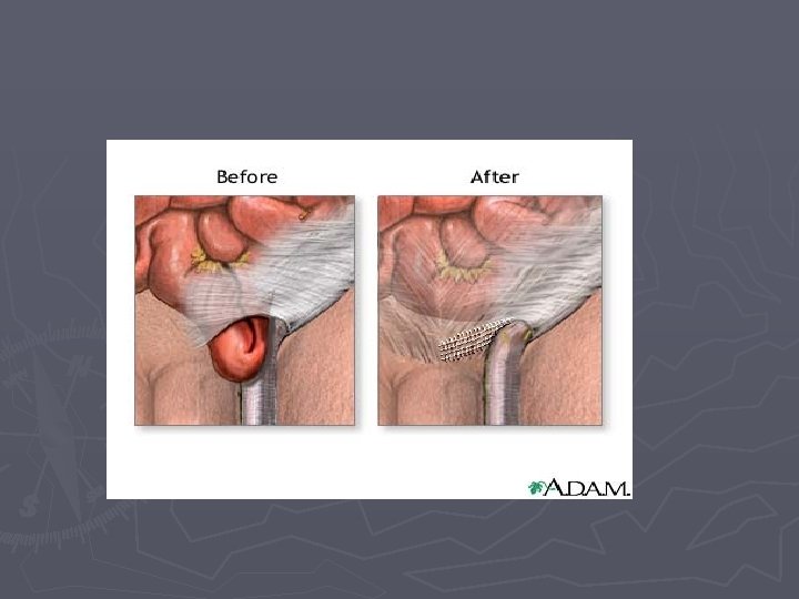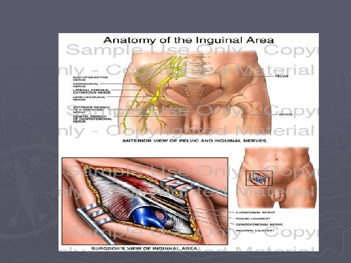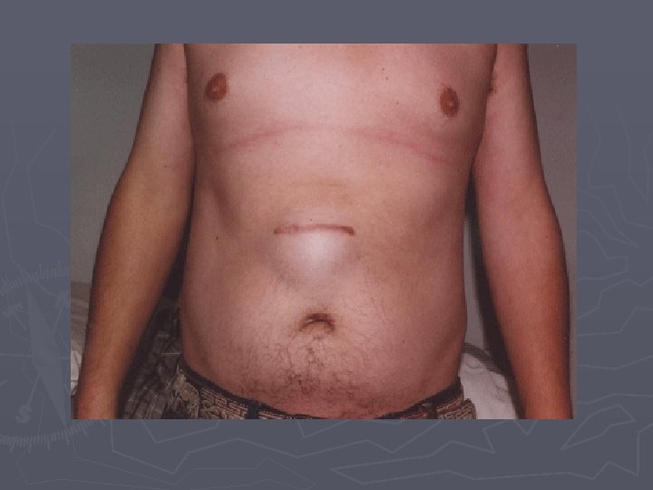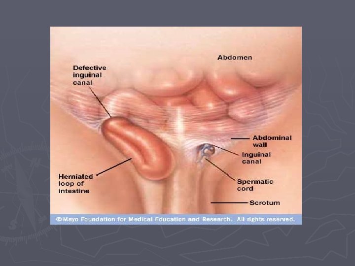 Hernias ► Imagine an inner tube poking through a hole in an old tire — that's what a hernia is like. ► Hernia occurs when organ protrudes through a weak muscle ► Abdominal- organs protrude through the abdominal wall ► Inguinal- occurs in the inguinal area