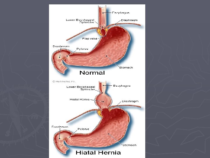Hiatal Hernia ► Hiatal hernia is a condition in which the stomach pushes through the diaphragm. ► The cause is unknown, but hiatal hernias may be the result of a weakening of the supporting tissue. Increasing age, obesity, and smoking are known risk factors in adults
