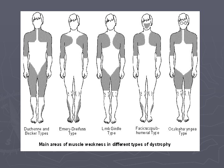 Muscular Dystrophy ► Group of inherited diseases ► Leads to chronic progressive muscle atrophy ► Usually appears in early childhood ► Most types result in total disability and early death ► P. T. is used to slow progress of dz