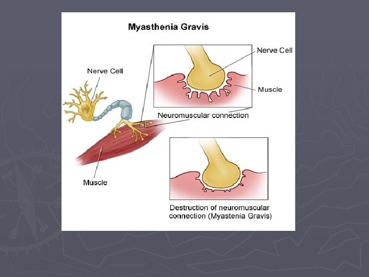 Myasthenia Gravis ► Chronic condition in which nerve impulses are not transmitted properly to the muscles ► Leads to progressive muscular weakness and paralysis ► Fatal when it affects the resp systems ► Etiology: unknown – maybe autoimmune affecting the myoneural function
