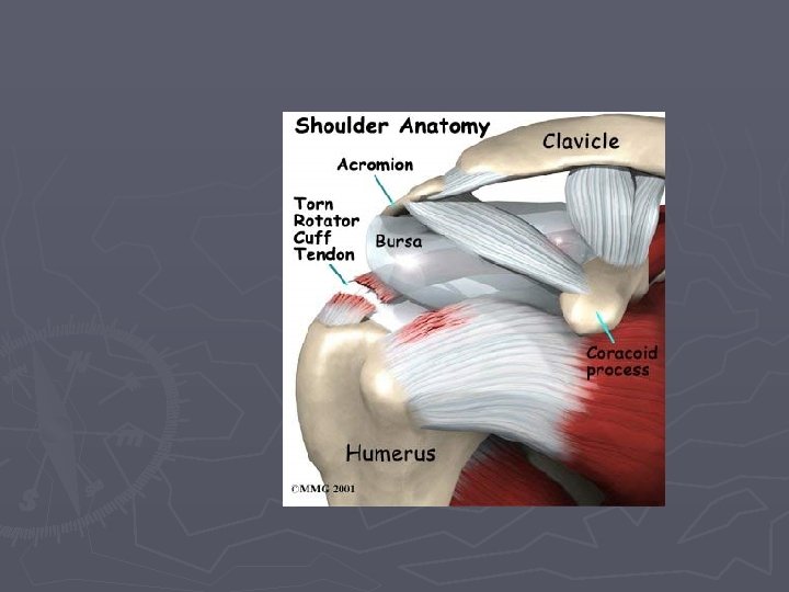 Rotator Cuff Disease ► Is an inflammation of a group of tendons that fuse together and surround the shoulder joint ► Can occur due to repetitive overhead swinging, such as swinging a tennis racquet or pitching a ball