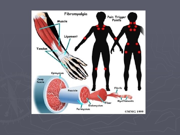 Fibromyalgia ► Chronic widespread muscle pain to specific muscle sites lasting 3 or more months ► Sx (Symptoms): muscle stiffness, numbness or tingling in the arms or legs, fatigue sleep disturbances, HA, and depression. ► Etiology: unknown, but stress, weather, and poor physical fitness affect the condition ► TX (Treatment): pain relief, PT, massage, ex, stress reduction, med to relax muscle and relieve pain
