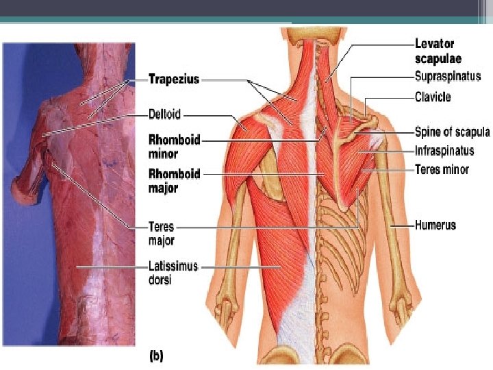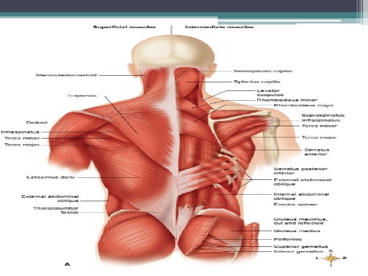 Superficial Muscles of Back. Superficial Deep Semispinalis capitis Sternocleidomastoid Splenius capitis Trapezius Levator scapulae Rhomboideus minor Rhomboideus major Supraspinatus Deltoid Infraspinatus Teres minor Teres major Erector spinae Serratus anterior extend, rotate, and laterally flex vertebral column Serratus posterior inferior Latissimus dorsi External abdominal oblique Thoracolumbar fascia Internal abdominal oblique Gluteus medius Gluteus minimus Gluteus maximus Lateral rotators upper limb movement