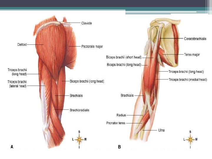 • Origin ▫ bony attachment at stationary end of muscle • Belly ▫ thicker, middle region of muscle between origin and insertion Origins Scapula Origins Humerus Bellies Extensors: Triceps brachii Long head Flexors: Biceps brachii Brachialis Lateral head • Insertion ▫ bony attachment to mobile. Insertion end of muscle Insertion Radius Ulna