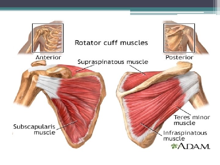 10 -61 Rotator Cuff Muscles Anterior Rotator cuff (SITS) muscles: Supraspinatus Infraspinatus Teres minor Posterior Clavicle Acromion Coracoid process Glenoid cavity Subscapularis Inferior angle