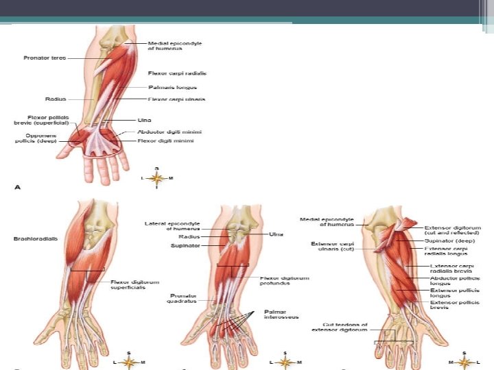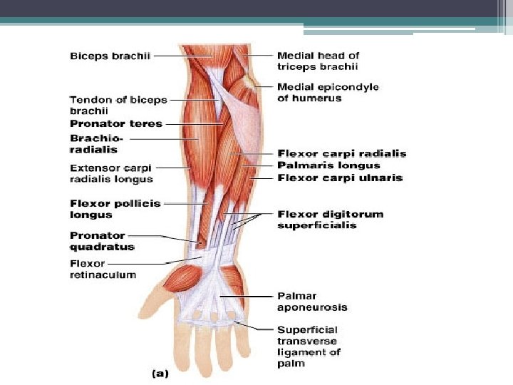 Anterior Muscles on Wrist and Hand • extrinsic muscles of the forearm • intrinsic muscles in the hand itself • extrinsic muscle actions ▫ flexion and extension of wrist and digits ▫ radial and ulnar flexion ▫ finger abduction and adduction ▫ thumb opposition . Biceps brachii Triceps brachii Brachialis Common flexor tendon Pronator teres Aponeurosis of biceps brachii Brachioradialis Flexor carpi radialis Palmaris longus Flexor carpi ulnaris Anterior view Interosseous membrane Extensor carpi radialis longus and brevis Flexor digitorum superficialis Flexor retinaculum Palmar aponeurosis (a) Superficial flexors (b) Intermediate flexor Supinator Flexor digitorum superficialis Flexor digitorum profundus Flexor pollicis longus Flexor digitorum superficialis tendons Flexor digitorum profundus tendons (c) Deep flexors