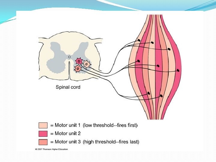 Recruitment of Motor Unit Single stimulus doesn’t affect entire muscle many motor unit Respond to different thresholds of stimulation At low intensity, only a few motor units respond Recruitment: increases the number of motor units being activated by increasing the intensity of the stimulus When all motor units are recruited, the muscle contracts with maximum tension