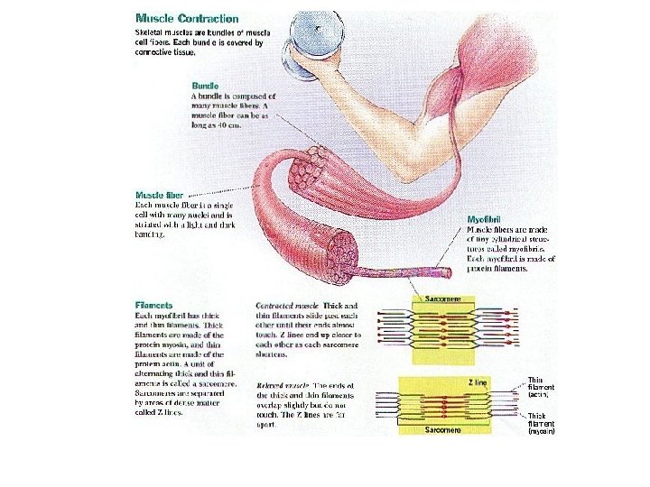 6. Active Muscles use a lot of Energy and require a continuous supply of Oxygen and Nutrients, which are supplied by Arteries. Muscles produce large amounts of Metabolic Waste that must be removed by Veins. 7. Muscle Fibers consist of Bundles of threadlike structures called MYOFIBRILS. 8. Each Myofibril is made up of TWO Types of Protein Filaments- Thick ones and Thin ones. 9. The THICK FILAMENTS are made up of a PROTEIN called MYOSIN. 10. The THIN FILAMENTS are made of a PROTEIN called ACTIN. 11. Myosin and Actin Filaments are arranged to form overlapping patterns, which are responsible for the Light and Dark Bands that can be seen in Skeletal (Striated Appearance) Muscle. 12. Thin Actin Filaments are Anchored at their Midpoints to a structure called the Z -LINE. 13. The Region From one Z-line to the next is called a SARCOMERE the Functional Unit of Muscle Contractions