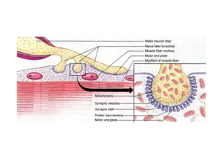 CONTROL OF MUSCLE CONTRACTION 1. Muscles are useful only if they Contract in a Controlled fashion. 2. Motor Neurons connect the CNS to Skeleton Muscle Cells (EFFECTORS); Impulses (ACTION POTENTIALS) from Motor Neurons Control the Contraction of Skeleton Muscle Cells. 3. The point of contact between a Motor Neuron and a Muscle Cell is called the NEUROMUSCULAR JUNCTION. 4. Vesicles, or pockets, in the AXON TERMINALS of the Motor Neuron release molecules of the NEUROTRANSMITTER ACETYLCHOLINE. 5. These molecules Diffuse across the SYNAPSE, producing and IMPULSE in the Cell Membrane of the Muscle Cell. 6. The impulse causes the release of Calcium ions within the cell. The Calcium Ions affect regulatory proteins that allow Actin and Myosin Filaments to interact and form cross-bridges.