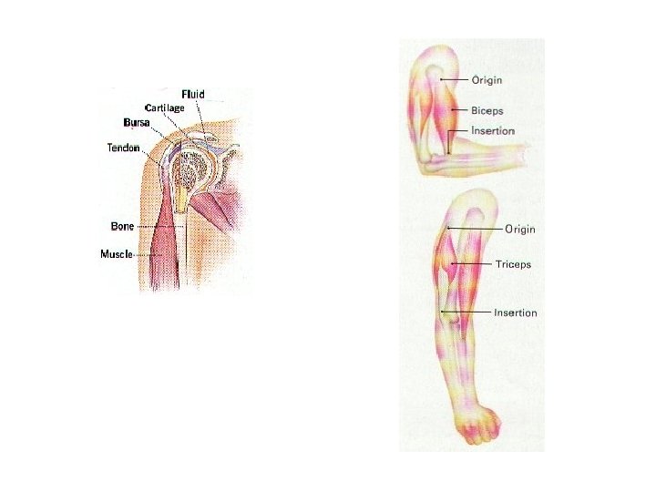 HOW MUSCLES AND BONES INTERACT 10. The Muscles of the upper arm are a good example of this dual action: ANTAGONISTIC MUSCLES. FLEXOR, A MUSCLE THAT BENDS A JOINT. EXTENSOR, A MUSCLE THAT STRAIGHTENS A JOINT. A. When the BICEPS Muscle (on the front of the upper arm, FLEXOR) CONTRACTS, it BENDS OR FLEXES THE ELBOW JOINT. B. When the TRICEPS Muscle (on the back of the upper arm, EXTENSOR) CONTRACTS, it opens, or extends, the elbow joint. C. A controlled movement requires contraction by both muscles. 11. ANTAGONISTIC MUSCLES ARE OPPONENTS, MUSCLES WHICH HAVE OPPOSING OR OPPOSITE FUNCTIONS. A muscle pulls when it contracts, but exerts no force when it relaxes and CANNOT PUSH. When one muscle Pulls a bone in one direction, another muscle is needed to PULL the bone in the other direction. 12. SYNERGISTIC MUSCLES ARE THOSE WITH THE SAME FUNCTION, OR THOSE THAT WORK TOGETHER TO PERFORM A PARTICULAR FUNCTION. They also stabilize a joint to make a more precise movement possible.