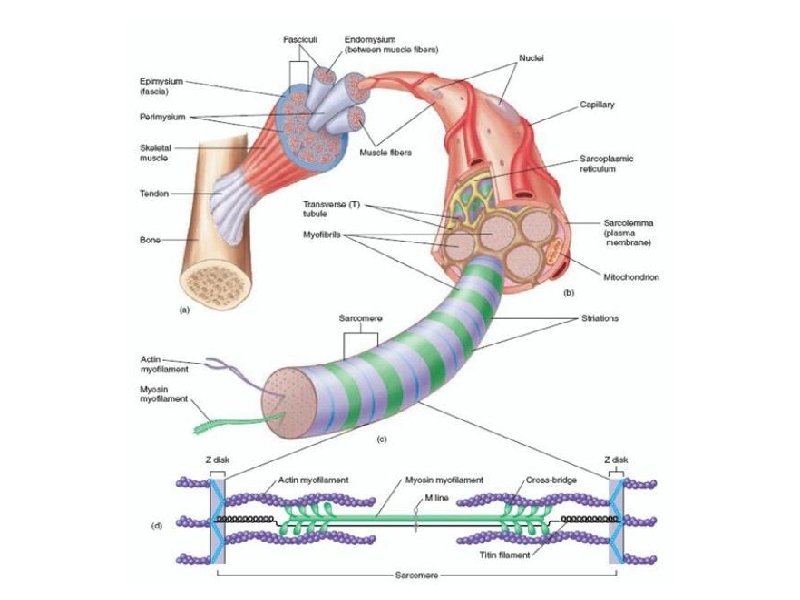 Structure of a Sarcomere (functional unit of a muscle) • Actin and Myosin filaments are arranged in an overlapping pattern of light (I bands) and dark (A bands). • In the middle of each I band is a line called a Z line. • The section of a myofibril from one Z line to the next Z line is the Sarcomere. • *The arrangement of these sarcomeres next to each other produces the striations of the skeletal muscle fibers. • Note: Each Myofibril is surrounded by a network of channels called Sarcoplasmic Reticulum. Transverse tubules pass through the fibers.
