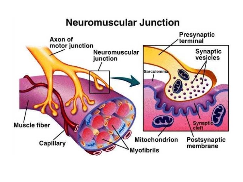 Muscles & the Nervous System 1. NEUROMUSCULAR JUNCTION - where a NERVE FIBER and muscle fiber come together. A. K. A. Myoneural junction. 2. MOTOR NEURON ENDINGS - nerve fiber caries the impulse that stimulates the muscle fibers 3. MOTOR END PLATE - specialized part of muscle fiber membrane (sarcolemma) located at the neuromuscular junction, has many folds 4. SYNAPTIC CLEFT - An actual "gap" or cleft which exits between the motor neuron endings and the motor end plate. 5. SYNAPTIC VESICLES - numerous vesicles in motor neuron endings, where neurotransmitters are stored before being released into the synaptic cleft. 6. NEUROTRANSMITTER - substance that is released from nerve endings into synaptic cleft. Stimulates an impulse. In this case, a "muscle impulse". One of the major neurotransmitters is ACETYLCHOLINE. This brings about muscle contractions. ACETYLCHOLINESTERASE is an enzyme that breaks down acetylcholine
