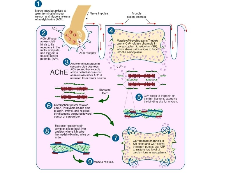 Events in a Muscle Contraction 1. A nerve impulse stimulates the release of a neurotransmitter (acetylcholine) from synaptic vesicles into the synaptic cleft. 2. The impulse spreads across the sarcolemma and into the fiber. This impulse causes an increase in the permeability to calcium ions. The S. R. has a high conc. of Ca++. 3. Calcium ions diffuse into the sarcoplasm. The Ca++ causes the formation of "cross bridges" between the actin and myosin filaments. 4. The filaments slide between each other, and this shortens the myofibrils, which in turn shorten the muscle fibers, which shortens the muscle. 5. A "Calcium Pump" returns the CA++ into the S. R. (requires energy. ATP) 6. The enzyme Acetylcholinesterase stops the action of Acetylcholine