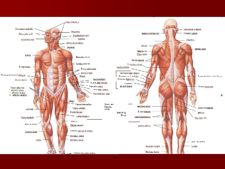 Classification of Muscle Group Actions Agonist (Prime Mover) – Muscle most responsible for movement n Antagonist – Opposes prime mover – Provides precision and control during prime mover contraction – Relaxes when prime mover contracts n Synergist – Aid prime mover – Contract at same time as prime mover n Fixator – Joint stabilizer – Maintains posture/balance during prime mover contraction n