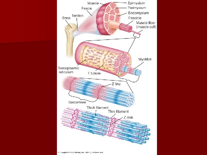 Skeletal Muscle Structure (connective tissue components) n Endomysium – delicate membrane that covers muscle fibers n Perimysium – tougher tissue that binds muscle fibers together into fascicles. n Epimysium – a coarse sheath that covers the muscle as a whole. n Tendon – strong cord of fibrous tissue that binds muscle to bone.