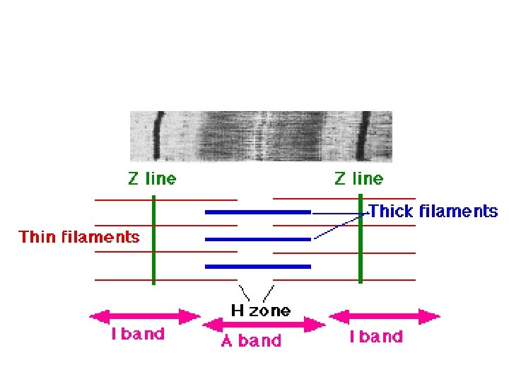 Muscle cell (fiber) cytoplasm Basic contractile unit of muscle fiber H zone Space between actin Sarcoplasm Z line Muscle fiber membrane I band Z line A band Bundle of microfilaments; almost fill sarcoplasm Length of myosin heads (wide, dark stripes) Allows impulses to travel along sarcolemma deeper into muscle cell (fiber) Length of actin (thin, light stripes) Network of tubules and sacs: pumps calcium ions in from sarcoplasm to store in sacs Allows impulse traveling down T tubule to stimulate adjacent sacs