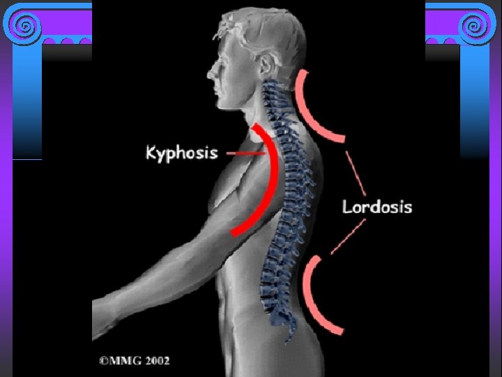 Common Assessment Abnormalities Kyphosis (round back) Anterioposterior or forward bending of spine with convexity of curve in posterior direction Common at thoracic and sacral levels Poor posture Tuberculosis Chronic arthritis Growth disturbance of vertebral epiphysis osteoporosis