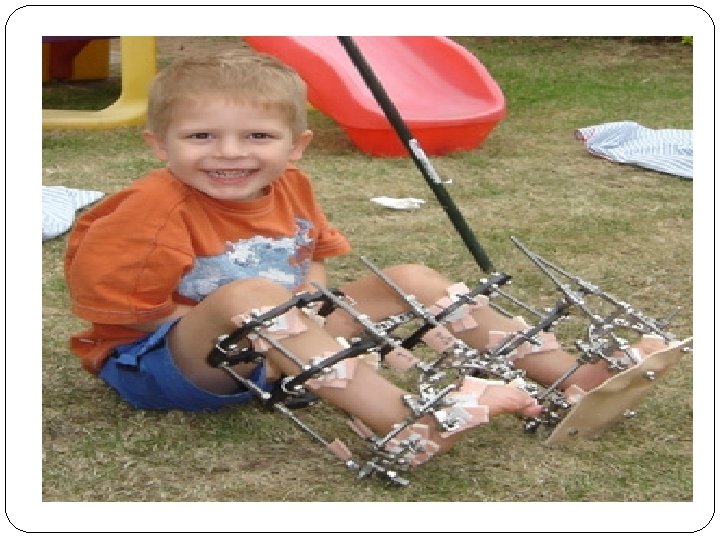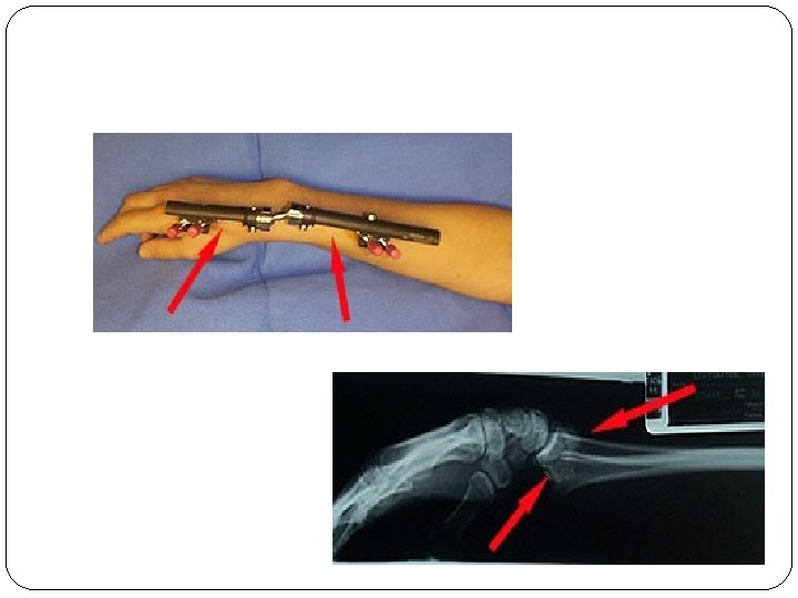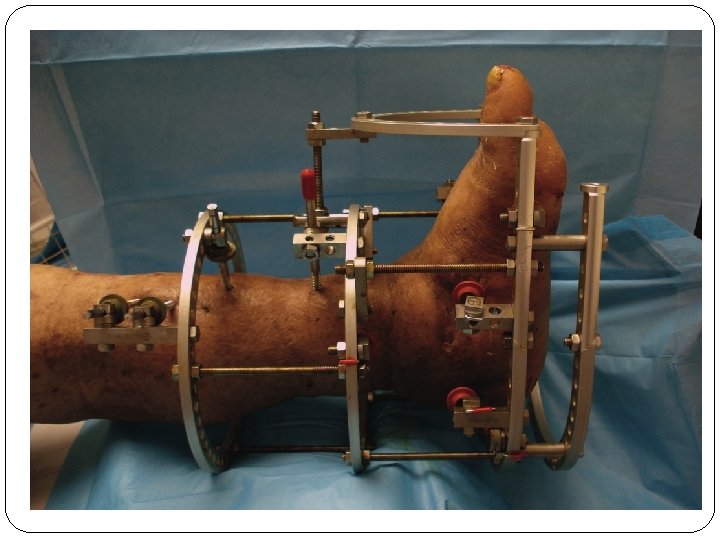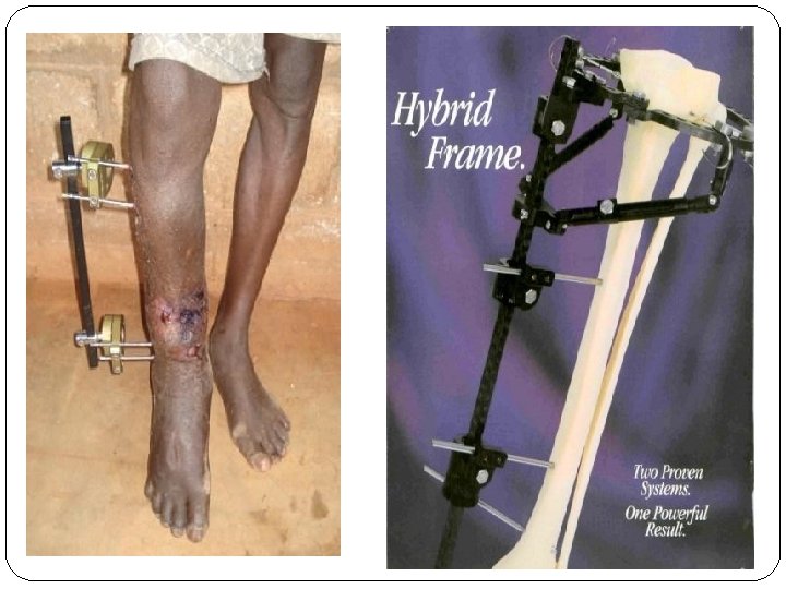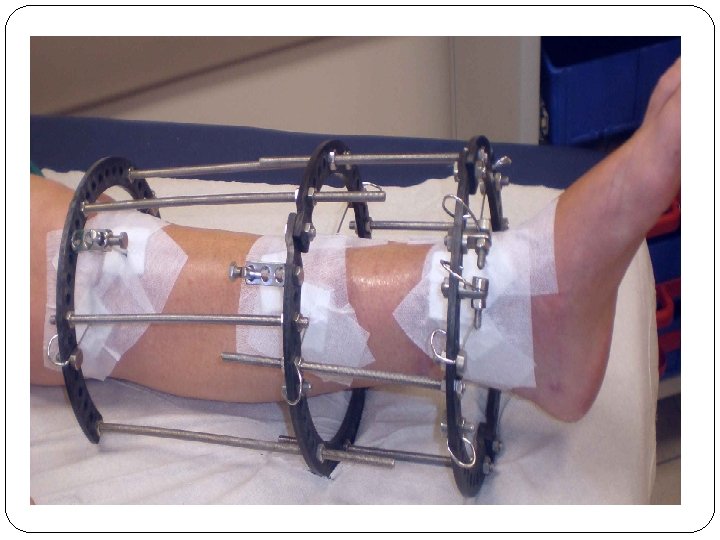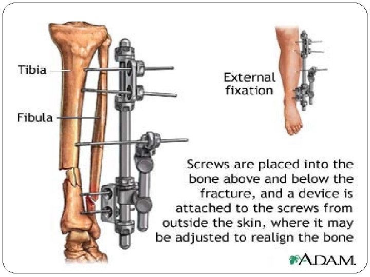 External Fixation � External fixation involves fracture immobilization using percutaneous pins and wires that are attached to a rigid external frame. � Used to treat: � Comminuted fracture with extensive soft tissue. � Leg length discrepancies from congenital defects. � Bone loss related to tumors or osteomyelitis. � Advantages include: � Immediate fracture stabilization. � Allows three plane correction of the injury. � Minimal blood loss occurs in comparison with internal fixation. � Allows for early mobilization and ambulation. � Disadvantages include: � � Risk of pin tract infection. Potential overwhelming appearance to client.