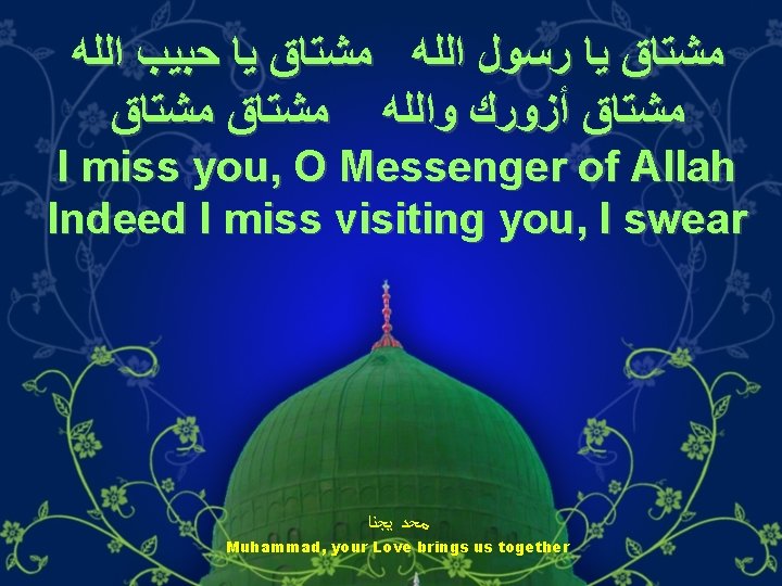 Mushtaq I miss you O Messenger of Allah Slides: 14 Download presentation ﻣﺸﺘﺎﻕ ﻳﺎ ﺭﺳـﻮﻝ ﺍﻟﻠﻪ Mushtaq, I miss you O Messenger of Allah ﺗﻌﻠﻖ ﺍﻟﻘﻠﺐ ﺑﺠﻤﺎﻟﻪ ﻭﺑﺼﻔﺎﺗﻪ ﻭﺑﺨﺼﺎﻟﻪ The hearth got attached by his beauty, qualities & Merits ﻣﺤﺩ ﻳﺠﻧﺎ Muhammad, your Love brings us together ﺃﻴﻤﺘﻰ ﺃﺤﻈﻰ ﺑﻨﻮﺍﻟﻪ ﻳﺎ ﺣﺒﻴﺒﻲ ﺍﻷﻤﺮ ﺿﺎﻕ When could I get his blessings O beloved, situations intensified ﻣﺤﺩ ﻳﺠﻧﺎ Muhammad, your Love brings us together ﻛﻢ ﻟﻪ ﺟﺎﺋﺖ ﺍﻟﺠﻤﻮﻉ ﺃﺸﻮﺍﻗﺎ ﺑﻴﻦ ﺍﻟﻀﻠﻮﻉ How many groups came to him, with feelings longing to you ﻣﺤﺩ ﻳﺠﻧﺎ Muhammad, your Love brings us together ﺑﻌﻄﺎﺀ ﺣﻠﻮ ﺍﻟﻤﺬﺍﻕ ﻭﺍﺭﺗﻮﻭﺍ ﻋﻨﺪ ﺍﻟﺮﺟﻮﻉ As they returned they satisfied their yearnings with the blessings ﻣﺤﺩ ﻳﺠﻧﺎ Muhammad, your Love brings us together ﻛﻦ ﺷﻔﻴﻌﻲ ﻓﻲ ﺍﻟﻘﻴﺎﻣﺔ ﻳﺎ ﻣﻈﻠﻞ ﺑﺎﻟﻐﻤﺎﻣﺔ You were shaded by clouds, be my interceder on Judgment day ﻣﺤﺩ ﻳﺠﻧﺎ Muhammad, your Love brings us together ﻣﻦ ﻧﺎﺭ ﻻ ﺗﻄﺎﻕ ﻛﻠﻨﺎ ﻧﺮﺟﻮﺍ ﺍﻟﺴﻼﻣﺔ You We all wish for safety from an unbearable fire ﻣﺤﺩ ﻳﺠﻧﺎ Muhammad, your Love brings us together ﺫﺍ ﻋﺒﻴﺪ ﺫﺍﺏ ﻋﺸﻘﺎ ﻳﺎ ﺭﺳﻮﻝ ﺍﻟﻠﻪ ﺭﻓﻘﺎ O Messenger of Allah, kindly, I’m a slave melting with love ﻣﺤﺩ ﻳﺠﻧﺎ Muhammad, your Love brings us together ﻛﺄﺴﻴﺮ ﻓﻲ ﻭﺛﺎﻕ ﻭﻋﻠﻰ ﺍﻷﻌﺘﺎﺏ ﻣﻠﻘﻰ At your doorsteps thrown Like a handcuffed hostage ﻣﺤﺩ ﻳﺠﻧﺎ Muhammad, your Love brings us together