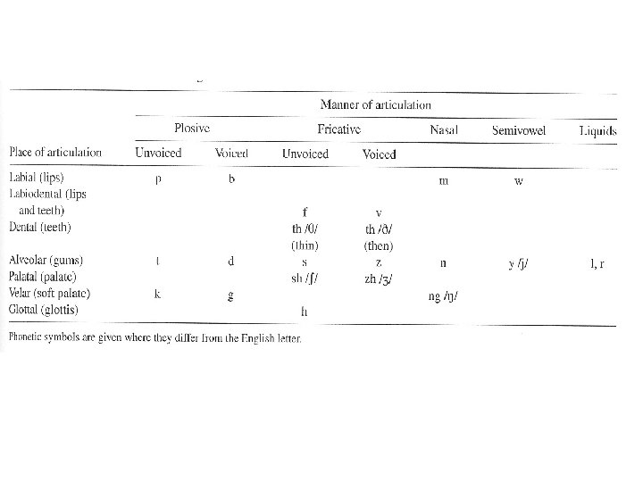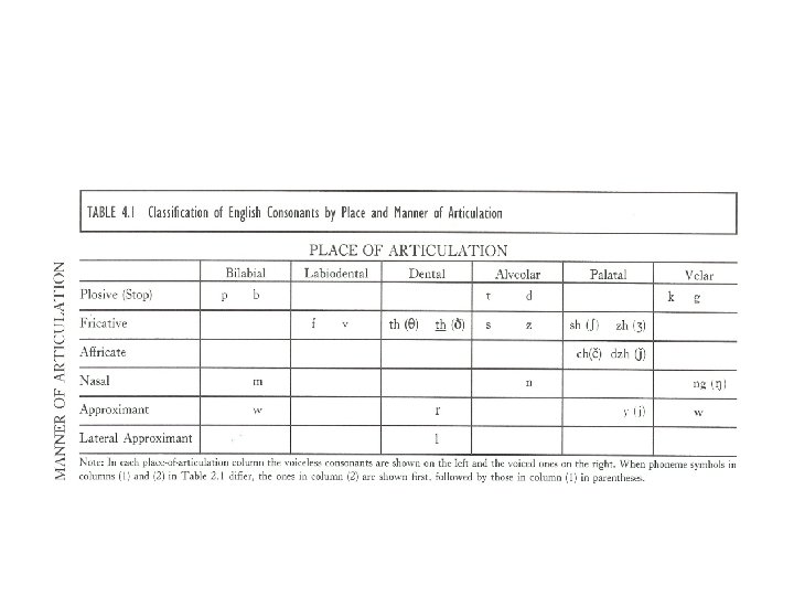 CONSONANTS INVOLVE VERY RAPID, SOMETIMES SUBTLE , CHANGES IN SOUND. CONSONANTS ARE MORE DIFFICULT TO ANALYZE AND TO DESCRIBE ACOUSTICALLY CONSONANTS MAY BE CLASSIFIED ACCORDING TO THE MANNER OF ARTICULATION AS PLOSIVE, FRICATIVE, NASAL, LIQUID, AND SEMIVOWEL. PLOSIVE CONSONANTS (p, b, t, etc. ) ARE PRODUCED BY BLOCKING THE FLOW OF AIR (USUALLY IN THE MOUTH) AND RELEASING THE PRESSURE RATHER SUDDENLY FRICATIVES (f, s, sh, etc. ) ARE MADE BY CONSTRICTING THE FLOW TO PRODUCE TURBULENCE NASALS (m, n, ng) ARE MADE BY LOWER THE SOFT PALATE TO CONNECT THE NASAL CAVITY TO THE PHARYNX AND BLOCKING THE MOUTH CAVITY SOMEWHERE SEMIVOWELS (w, y) ARE PRODUCED BY KEEPING THE VOCAL TRACT BRIEFLY IN A VOWEL POSITION AND THEN CHANGING IT RAIDLY TO THE VOWEL SOUND THAT FOLLOWS IN SOUND THE LIQUIDS (r, l) THE TIP OF THE TONGUE IS RAISED AND THE ORAL CAVITY IS SOMEWHAT RESTRICTED