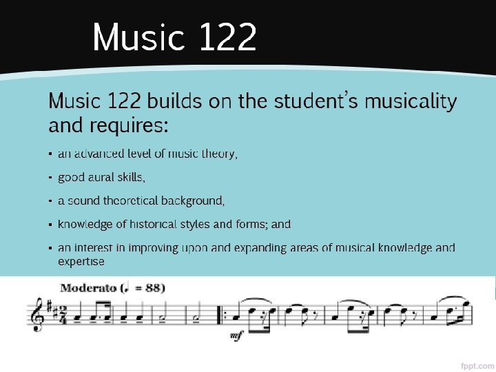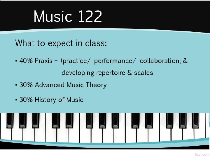 Music 112 & 113 v This course is intended for those students who were successful in music in grade 9 and 10 and wish to extend their study beyond that introduction v The course is divided into three broad categories: 1. Praxis, which is the practical instrumental component to the course 2. Music Theory & 3. Music History