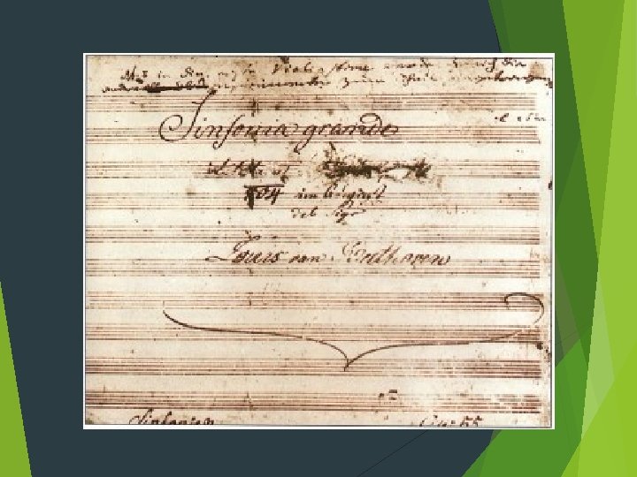 Ludwig von Beethoven (1770 - 1827) Born in Bonn, Germany, Beethoven’s father (a drunk) expected him to be a child prodigy. Beethoven was abused and forced to practice. He did receive lessons from both Mozart and Haydn. Pianist, conductor and composer – known for his exceptional skill at improvisation Friends with nobility but never had a patron or a steady job. He was the first to be a successful freelance composer. Portrayal of his innermost feelings and his love of nature is apparent within his music Lost his hearing Beethoven became the link between Classical and Romantic periods