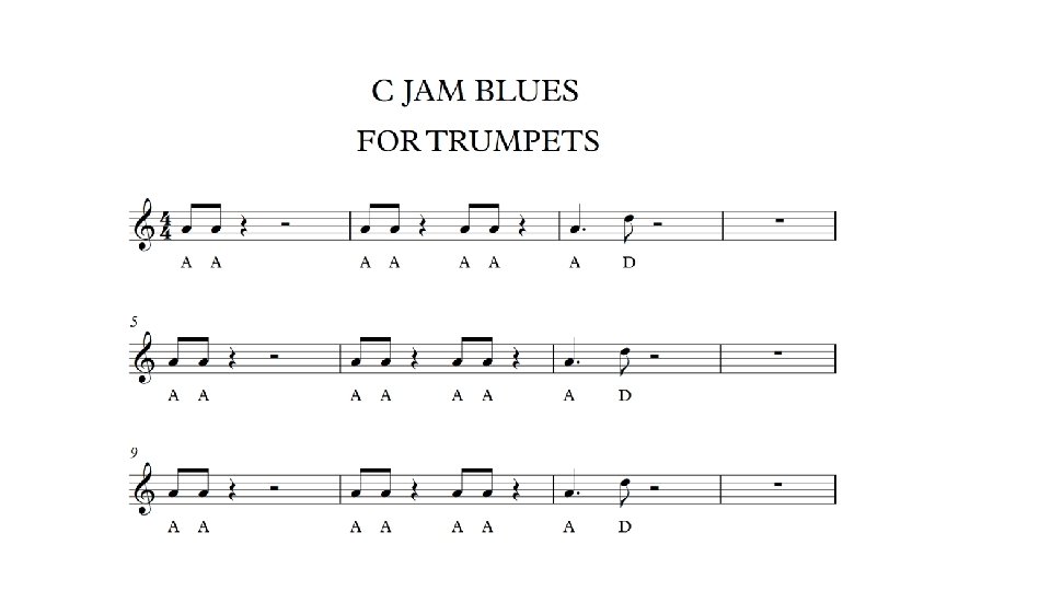 Remember that when these songs and films were made they were very hard times and people needed cheering up. George Formby certainly did that and was very popular. Let’s have another look at the “C Jam Blues” Hopefully you have had a chance to practice on your instruments. Remember – the music is different for different instruments so Make sure you are using the correct version, otherwise it will sound terrible! The music is at the end of this presentation.