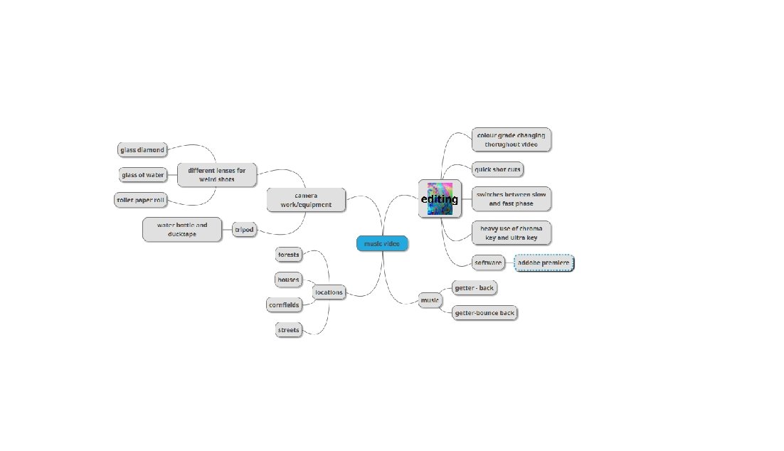 Music video ideas Idea 1 Film myself and my friends exploring an abandoned building Idea 2 Get on a random bus and film the exploration of the end destination Idea 3 Take an unknown substance and film the aftermath Idea 4 Get kidnapped and film the escape Final idea: Take an unknown substance and film the aftermath