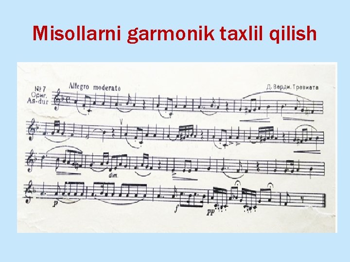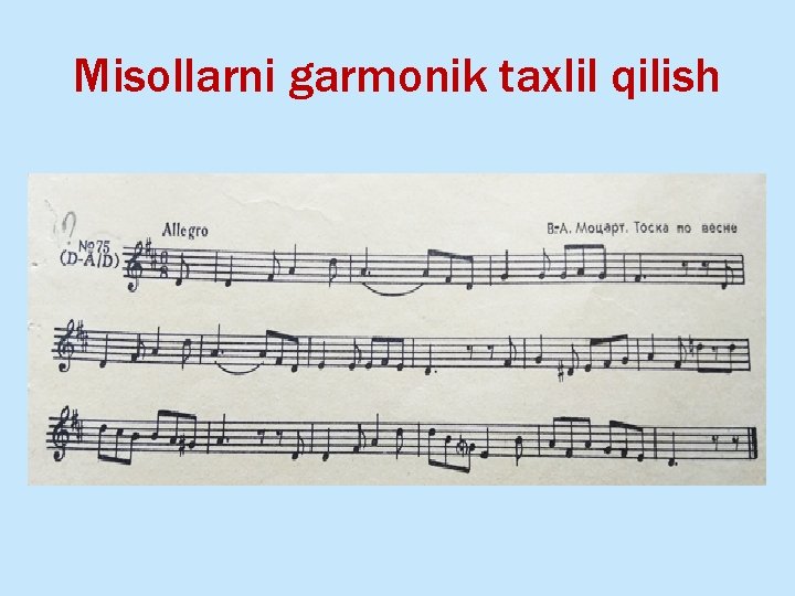 Musiqiy nomеrni tahlil qilib kuylash bo`yicha instruktsiyasi. • 1. Nomеr qaysi tonallikda yozilganligini aniqlang. • 2. Matnni iboralarga ajrating, nafas olish joylarini aniqlang. • 3. Har bir iborani ritmik usulini sanab urib chiqing. • 4. Intonatsion jihatdan qiyin joylarini aniqlab, ularni ustida ishlashda siz uchun qulay yo`lini topib kuylang (masalan, gamma aytish orqali yoki muayyan intеrval ohangi yordamida kеrakli tovushga tushish). • 5. Yarim tonliklarning tortilishi, noturg`un pog`onaning еchilishini eslab kuylang. • 6. Nota matnini dirijyorlik bilan ijro eting.