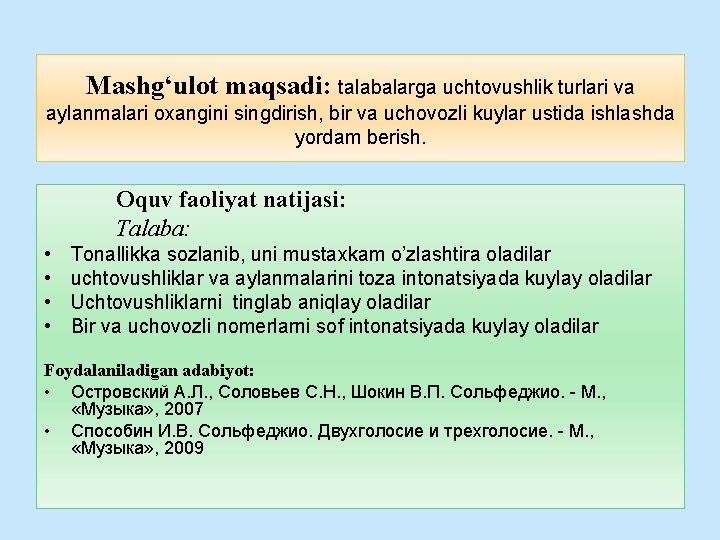 Mashg‘ulot maqsadi: talabalarga uchtovushlik turlari va aylanmalari oxangini singdirish, bir va uchovozli kuylar ustida ishlashda yordam berish. Oquv faoliyat natijasi: Talaba: • • Tonallikka sozlanib, uni mustaxkam o’zlashtira oladilar uchtovushliklar va aylanmalarini toza intonatsiyada kuylay oladilar Uchtovushliklarni tinglab aniqlay oladilar Bir va uchovozli nomerlarni sof intonatsiyada kuylay oladilar Foydalaniladigan adabiyot: • Островский А. Л. , Соловьев С. Н. , Шокин В. П. Сольфеджио. - М. , «Музыка» , 2007 • Способин И. В. Сольфеджио. Двухголосие и трехголосие. - М. , «Музыка» , 2009