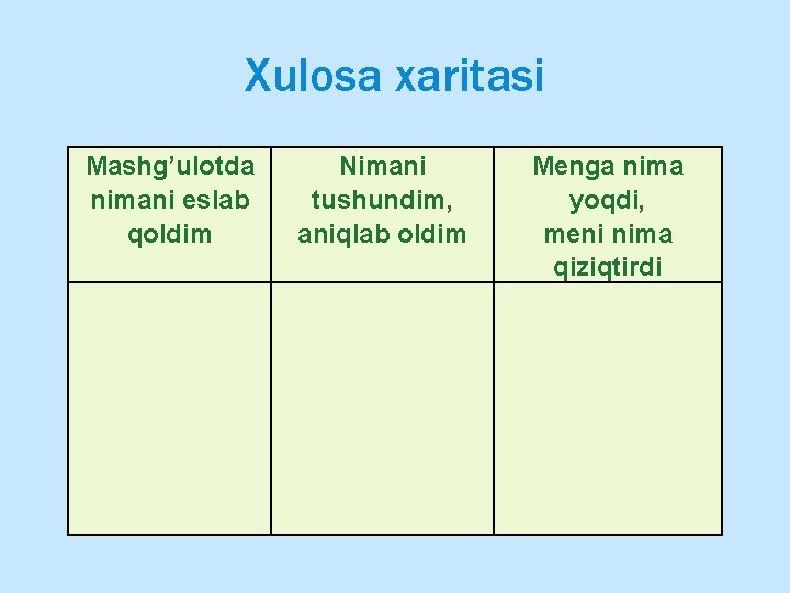 Xulosa xaritasi Mashg’ulotda nimani eslab qoldim Nimani tushundim, aniqlab oldim Menga nima yoqdi, meni nima qiziqtirdi