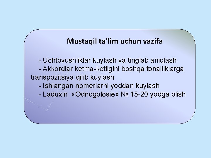 Mustaqil ta'lim uchun vazifa - Uchtovushliklar kuylash va tinglab aniqlash - Akkordlar ketma-ketligini boshqa tonalliklarga transpozitsiya qilib kuylash - Ishlangan nomerlarni yoddan kuylash - Laduxin «Odnogolosie» № 15 -20 yodga olish