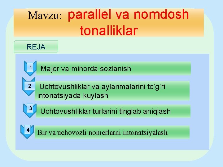 Mavzu: parallel va nomdosh tonalliklar REJA 1 2 3 4 Major va minorda sozlanish Uchtovushliklar va aylanmalarini to’g’ri intonatsiyada kuylash Uchtovushliklar turlarini tinglab aniqlash Bir va uchovozli nomerlarni intonatsiyalash