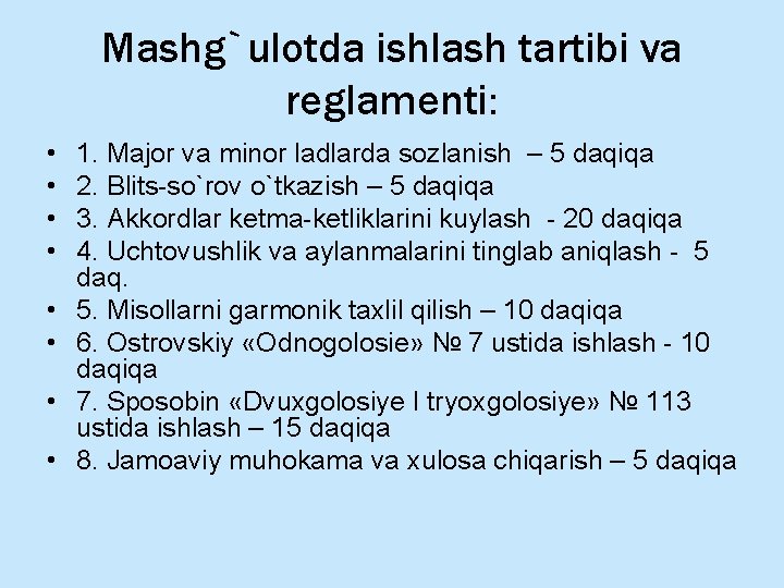 Mashg`ulotda ishlash tartibi va reglamenti: • • 1. Major va minor ladlarda sozlanish – 5 daqiqa 2. Blits-so`rov o`tkazish – 5 daqiqa 3. Akkordlar ketma-ketliklarini kuylash - 20 daqiqa 4. Uchtovushlik va aylanmalarini tinglab aniqlash - 5 daq. 5. Misollarni garmonik taxlil qilish – 10 daqiqa 6. Ostrovskiy «Odnogolosie» № 7 ustida ishlash - 10 daqiqa 7. Sposobin «Dvuxgolosiye I tryoxgolosiye» № 113 ustida ishlash – 15 daqiqa 8. Jamoaviy muhokama va xulosa chiqarish – 5 daqiqa
