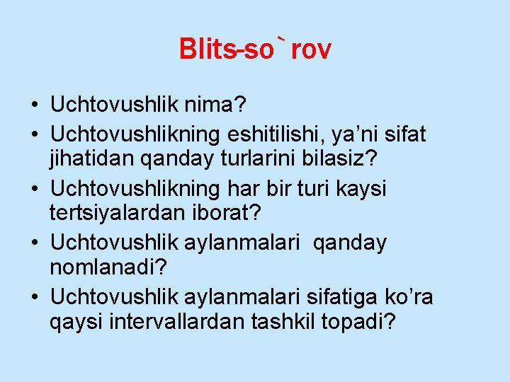 Blits-so`rov • Uchtovushlik nima? • Uchtovushlikning eshitilishi, ya’ni sifat jihatidan qanday turlarini bilasiz? • Uchtovushlikning har bir turi kaysi tertsiyalardan iborat? • Uchtovushlik aylanmalari qanday nomlanadi? • Uchtovushlik aylanmalari sifatiga ko’ra qaysi intervallardan tashkil topadi?