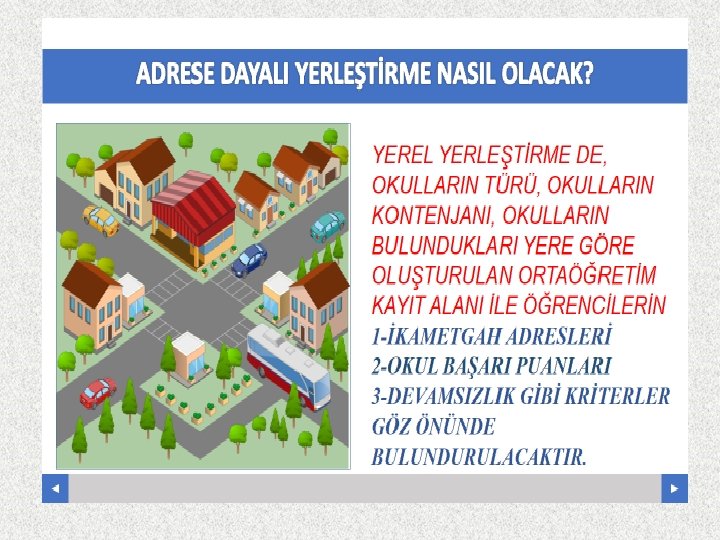 YEREL YERLEŞTİRMEDE KRİTERLER 1. İKAMET ADRESİ 2. ORTAOKUL BAŞARI NOTU (Ortaokulun 6, 7 ve 8'inci sınıf seviyesinde alınan yılsonu başarı puanlarının aritmetik ortalaması ile elde edilen ve virgülden sonra dört basamak yürütülen puanı) 3. DEVAMSIZLIK(8. sınıfa ait özürsüz devamsızlık) 4. YAŞ(Yaşı küçük olana öncelik)