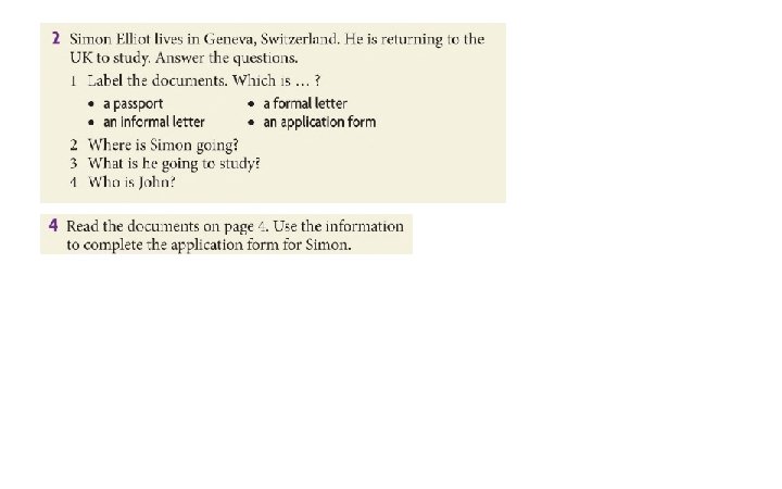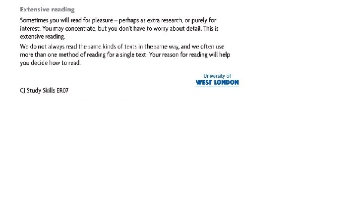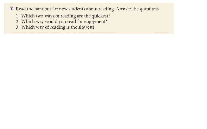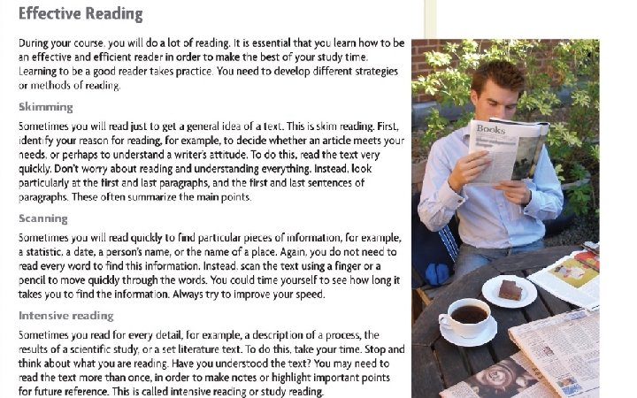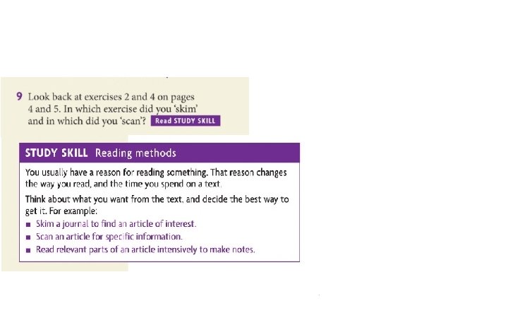 Material Type Why? How? Textbooks To make notes Read intensively Novels For pleasure Read extensively emails For messages from friends Scan then read intensively Search engine finds To find information scan Journals To look for interesting articles Skim Reports To find information Skim then intensively timetables To find time of something scan Dictionary To find a word scan Instruction manual to find out how sth works Intensively