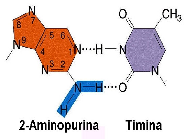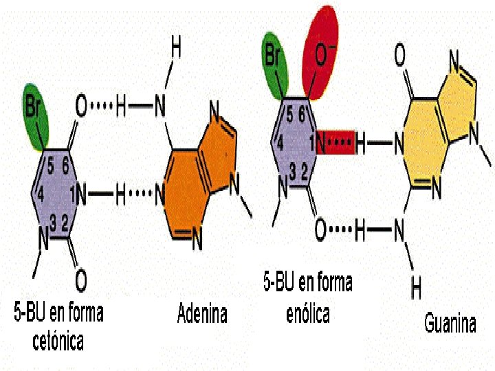 MUTACIONES INDUCIDAS MECANISMOS DE MUTAGÉNESIS Los principales mecanismos por los que se producen las mutaciones son los siguientes: 1. Remplazar una base en el ADN. 2. Mutágenos que alteran las bases produciendo emparejamientos erróneos específicos. 3. Agentes de tipo intercalante. 4. Mutágenos que producen pérdida del emparejamiento específico. 1. Remplazar una base en el ADN: Los análogos de bases son compuestos químicos que pueden remplazar a una base determinada. Por ejemplo, el 5 -Bromouracilo (5 BU) es análogo de la Timina (T) y puede remplazarla. El 5 BU en su forma cetónica empareja con la Adenina (A) mientras que en su forma enólica (5 BU*) empareja con la Guanina (G). El 5 BU es más inestable y produce transiciones. La 2 -Aminopurina (2 AP) es análogo de la Adenina (A) y puede remplazarla. La 2 AP aparea con la Timina (T) pero en su forma imíno (2 AP*) empareja con la Citosina (C). Esta alteración produce transiciones.