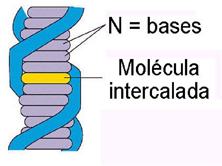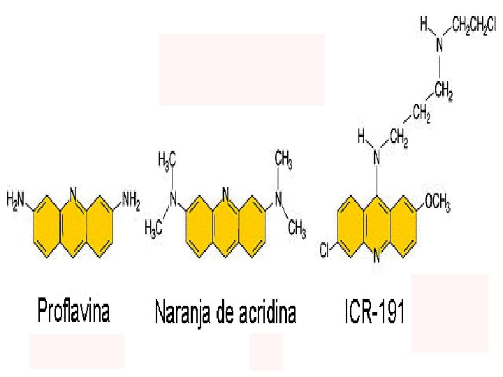 2. Mutágenos que alteran las bases produciendo emparejamientos erróneos específicos: existen varios tipos de agentes mutagénicos que alteran las bases nitrogenadas produciendo emparejamientos erróneos 3. Agentes alquilantes: como el EMS que añade radicales etilo y produce transiciones GC→AT. La NG añade radicales metilo y produce también transiciones GC→AT. 4. Hidroxilamina (HA): produce específicamente transiciones GC→AT. 5. Iones bisulfito y ácido nitroso: producen desaminación. El ácido nitroso transforma la Citosina (C) en Uracilo (U), el Uracilo (U) empareja con la Adenina (A) produciendo transiciones. La desaminación de las Adenina (A) la convierte en hipoxantina (H) que empareja con la Citosina (C) produciendo transiciones. 6 Agentes de tipo intercalante como la Proflavina, Naranja de acridina y Compuestos ICR: son compuestos con estructuras planas que se meten o intercalan entre las bases nitrogenadas del ADN produciendo adiciones o deleciones de un solo par de nucleótidos