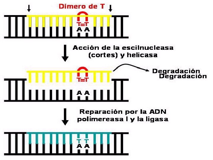 Reparación por recombinación: Cuando la ADN polimerasa III encuentra un dímero de Timina (T) producido por luz UV no sabe que nucleótido poner saltando la región y dejando un hueco. Como consecuencia esa región queda como ADN de hélice sencilla. Debido a que la luz UV produce muchos dímeros de Timina, se produce un bloqueo en la replicación y para evitar que la célula muera y pueda replicarse se dispara el sistema de emergencia SOS. La puesta en marcha del sistema SOS comienza porque el ADN de hélice sencilla activa a la proteína Rec. A que a su vez interacciona con la proteína Lex. A. La proteína Lex. A es un represor de los genes uvr. A, uvr. B, uvr. D, sul. A y sul. B. Todos estos genes tienen en el promotor una secuencia denominada caja SOS. La proteína Lex. A normalmente impide la transcripción o expresión de los genes citados anteriormente, pero cuando interacciona con la proteína Rec. A deja de impedir la expresión de estos genes, pudiéndose sintetizar las proteínas correspondientes y reparar los daños producidos por la luz UV