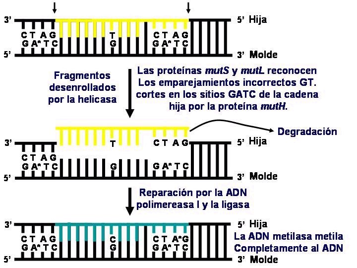REPARACIÓN POSTERIOR A LA REPLICACIÓN Reparación de apareamientos incorrectos: la reparación de apareamientos incorrectos posterior a la replicación requiere la existencia de un sistema que sea capaz de realizar las siguientes operaciones: Reconocer las bases mal apareadas. Determinar cual de las dos bases es la incorrecta. Eliminar la base incorrecta y sintetizar. Esta reparación la realizan los productos de los genes mut. H, mut. L, mut. S y mut. U. Además, para distinguir la hélice de nueva síntesis de la hélice molde y así saber eliminar la base incorrecta, el sistema consiste utiliza el hecho de que la hélice de nueva síntesis tarda un cierto tiempo en metilarse la Adenina (A) de la secuencia GATC, mientras que la A de la secuencia GATC de la hélice molde ya está metilada. El enzima que reconoce la secuencia GATC metilando la A que contiene es la Metilasa de Adenina