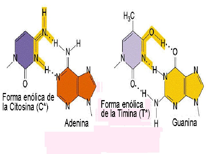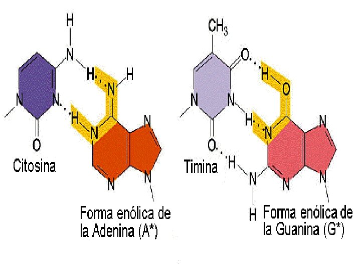 • ERRORES EN LA REPLICACIÓN Vamos a considerar tres tipos de errores durante la replicación del ADN: La tautomería: las bases nitorgenadas se encuentran habitualmente en su forma cetónica y con menos frecuencia aparecen en su forma tautomérica enólica o imino. Las formas tautoméricas o enólicas de las bases nitrogenadas (A*, T*, G* y C*) muestran relaciones de apareamiento distintas: A*-C, T*-G, G*-T y C*-A. El cambio de la forma normal cetónica a la forma enólica produce transiciones. Las mutaciones de cambio de fase o pauta de lectura: se trata de inserciones o deleciones de uno o muy pocos nucleótidos. Según un modelo propuesto por Streisinger, estas mutaciones se producen con frecuencia en regiones con secuencias repetidas. En las regiones con secuencias repetidas, por ejemplo, AAAAAA. . . , o por ejemplo, ATATATAT. . , durante la replicación se puede producir el deslizamiento de una de las dos hélices (la hélice molde o la de nueva síntesis) dando lugar a lo que se llama el "apareamiento erróneo deslizado". El deslizamiento de la hélice de nueva síntesis da lugar a una adición, mientras que el deslizamiento de la hélice molde origina una deleción Deleciones y duplicaciones grandes: las deleciones y duplicaciones de regiones relativamente grandes también se han detectado con bastante frecuencia en regiones con secuencias repetidas. En el gen lac I de E. coli se han detectado deleciones grandes que tienen lugar entre secuencias repetidas. Se cree que estas mutaciones podrían producirse por un sistema semejante al propuesto por Streisinger ("Apareamiento erróneo deslizado") o bien por sobrecruzamiento desigual. Del sobrecruzamiento desigual hablaremos más adelante en el curso.