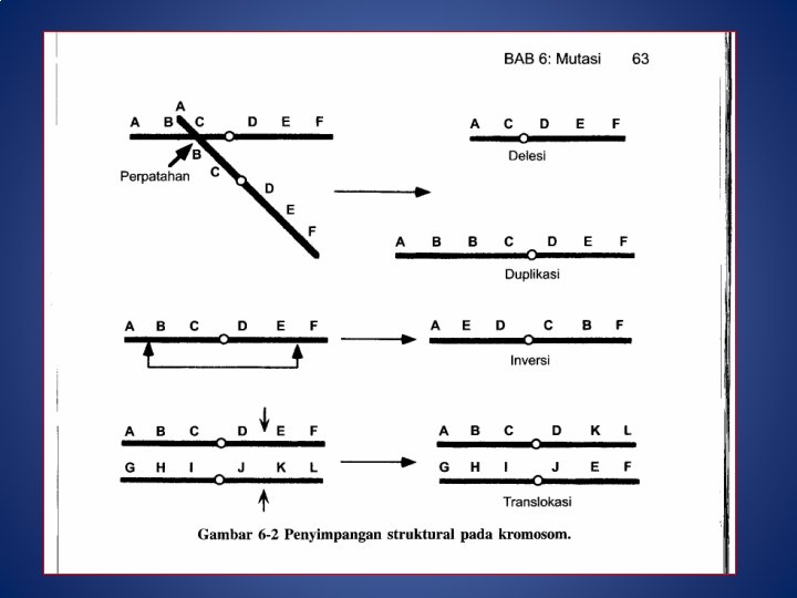 2. PERUBAHAN STRUKTUR KROMOSOM A. Delesi Hilangnya satu atau lebih segmen gen atau kromosom. B. Duplikasi Terdapat satu atau lebih salinan segmen kromosom pada kromosom itu sendiri atau kromosom lain. Terjadi pada 2 untai DNA homolog saling tumpang tindih, putus pada 2 tempat berbeda