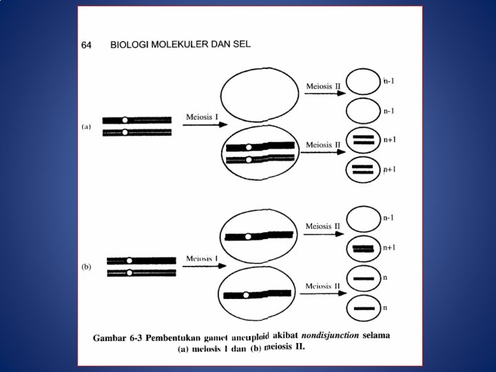 B. Aneuploidi Perubahan jumlah individual pada kromosom homolog dalam satu set kromosom Akibat adanya nondisjunction (kegagalan berpisah) selama meiosis. Contoh : Trisomi (2 n+1) Langdon-Down (1866) Idiot mongoloid Sindroma Down Khas : Sidik dermatoglifik , garis-garis pada kedua telapak tangan. (Umur rata-rata 16 th)